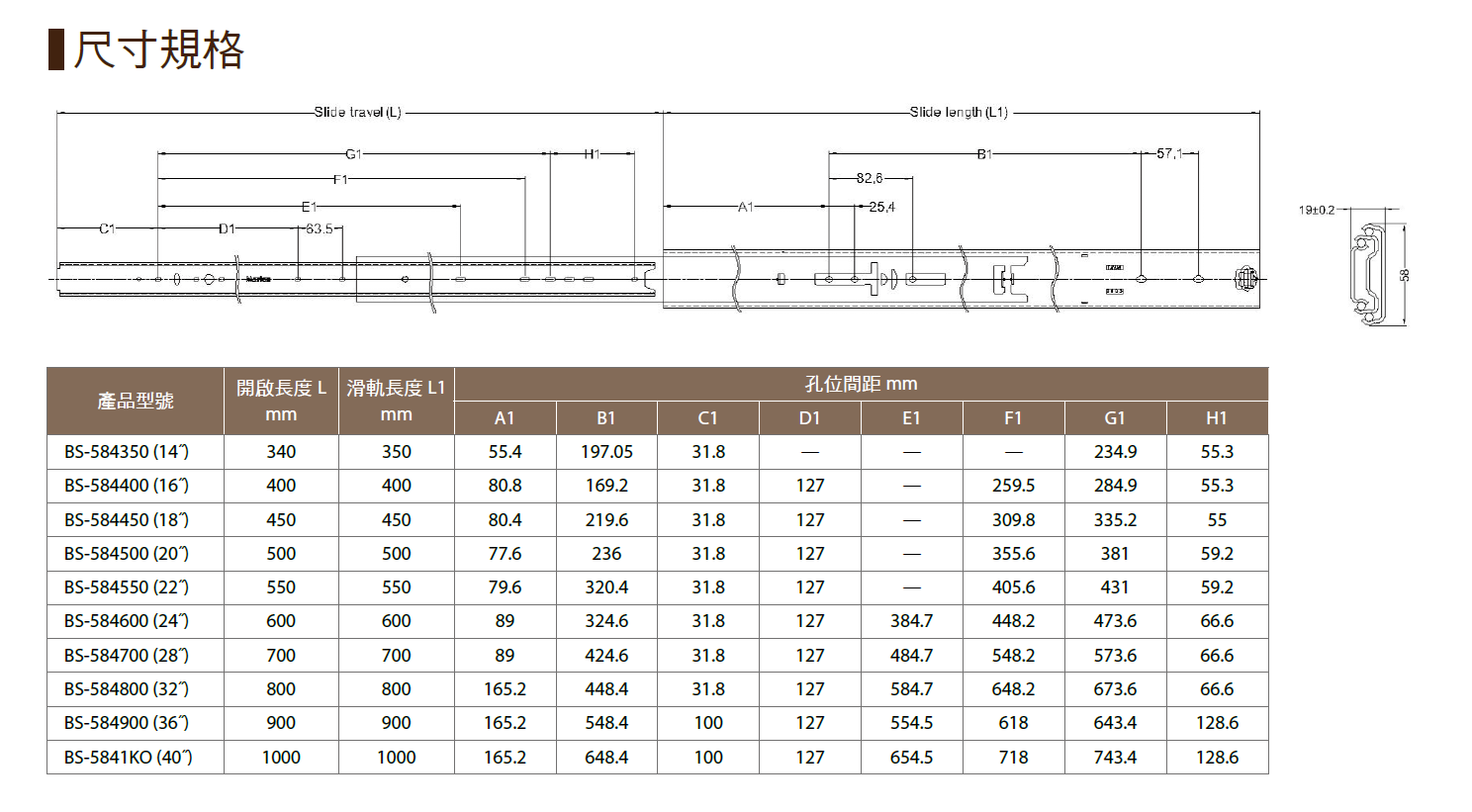 間距 : 3/4˝ =19.0mm(+1/61˝ ; - 0˝)